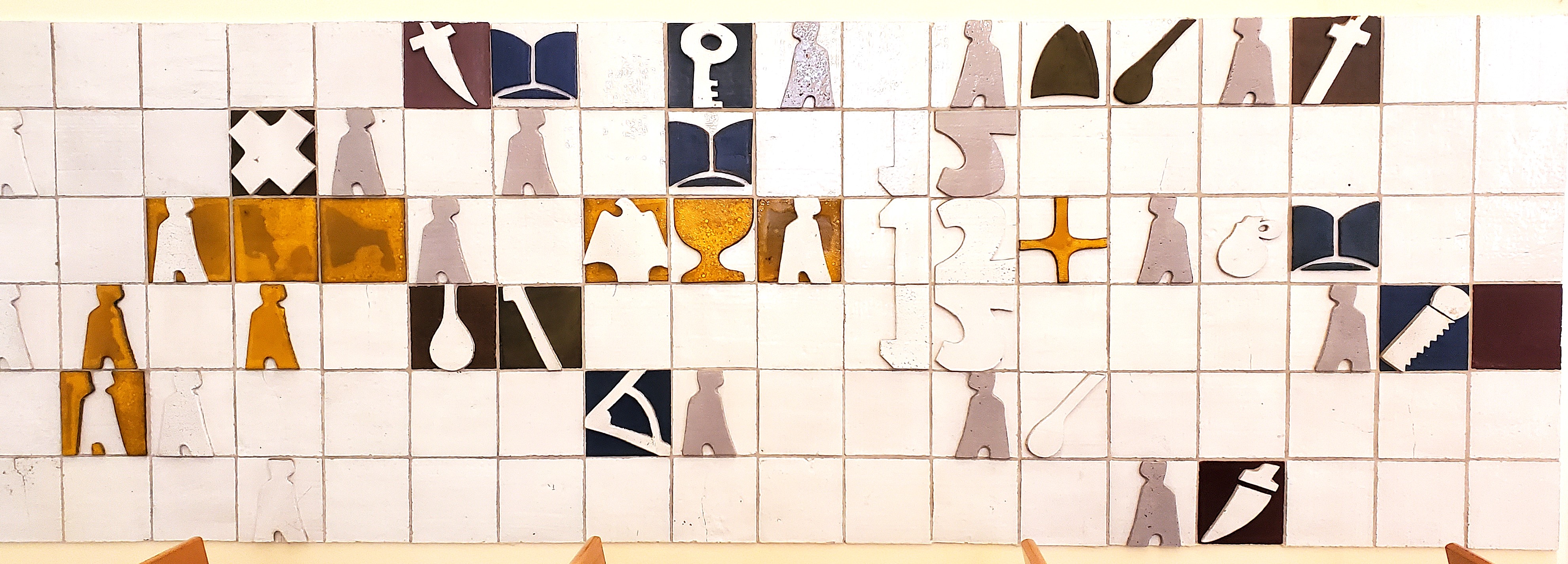 Auf der Wand links vom Eingang sind die Besucher dieser Kirche dargestellt. Die Farben GELB und WEISS deuten an, dass sie hinein-genommen sind in die eine heilige, christliche Kirche, die Gemeinde der Heiligen. Ihnen voran gehen die zwölf Aposten. Zentral herausgehoben ist in GELB und WEISS der Namensgeber der Gemeinde, St. Johannes, mit seinen Symbolen Adler und Kelch. Um ihn herum gruppieren sich in GRAU die anderen Apostel mit ihren Symbolen.