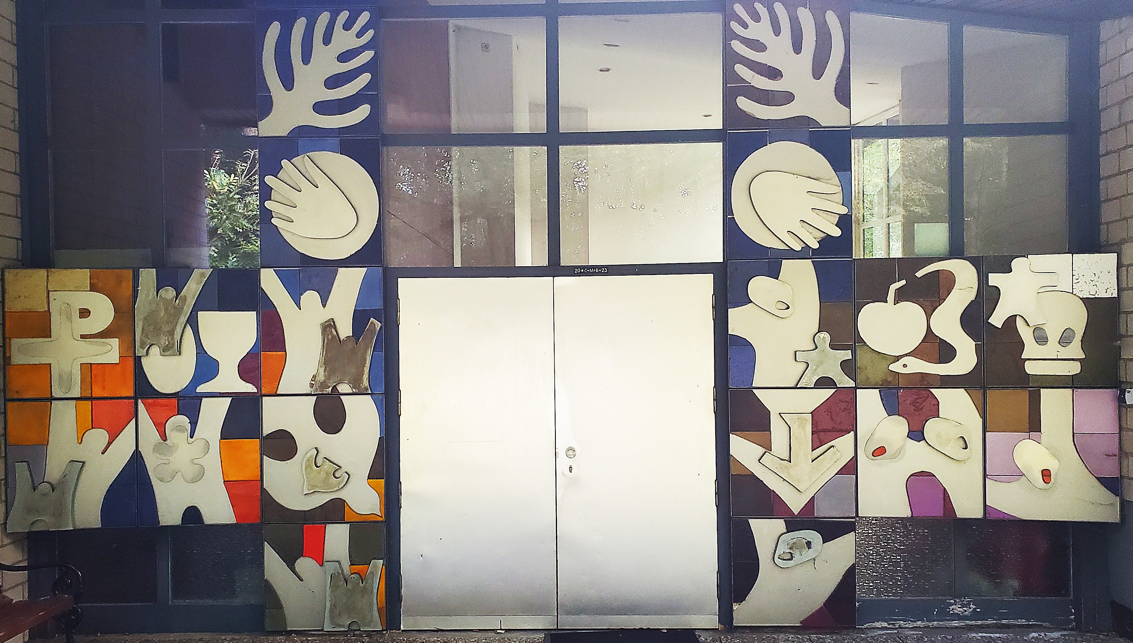 Das Kirchenportal veranschaulicht das Thema "Weltgericht", das wir an Kirchen und Kathedralen seit etwa 1100 n.Chr. kennen. Die Reliefplatten aus Aluminim mit eingelegten, sehr farbigen Keramiktafeln wirken auf den vorbeigehenden Passanten wie Signale. Die Reliefplatten kommen, ausgebreiteten Armen gleich, dem Betrachter entgegen. Umwelt soll hier angesprochen werden.